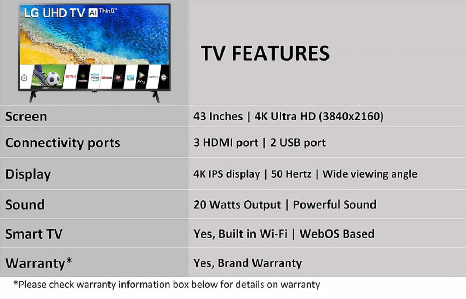 Smart TV Features : AI ThinQ (Needs Magic Remote that can be purchased separately) | Web OS | Magic mobile connection | Quad core processor | Cloud photo and video